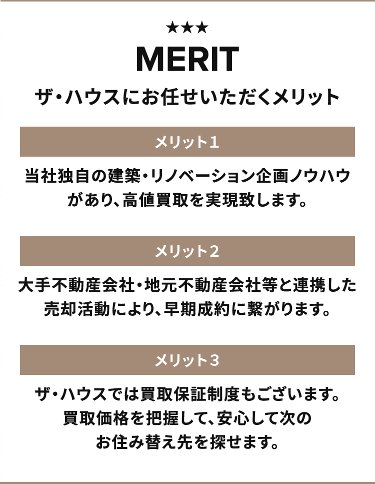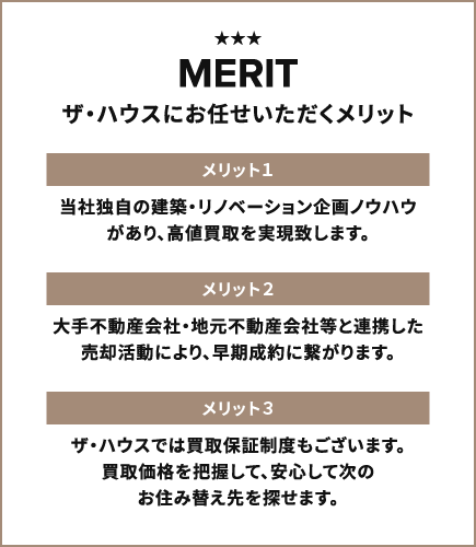 株式会社ザ・ハウスはお客様との確固たる関係性を構築し、堅実に信用を重んじ、付加価値の追求をし、そして安全・安心・満足をご提供できる不動産取引を実現してまいります。